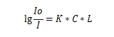 式中:I0—入射光強度,I —透過光強度,C—有色物質(zhì)濃度, L—有色溶液厚度,K—常數(shù)