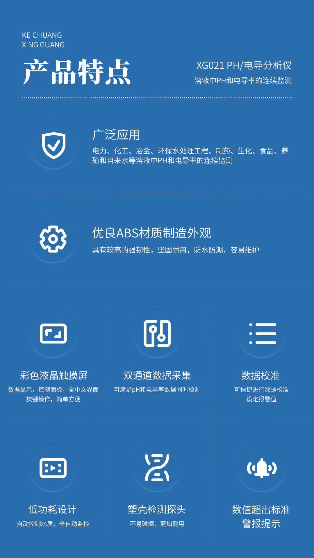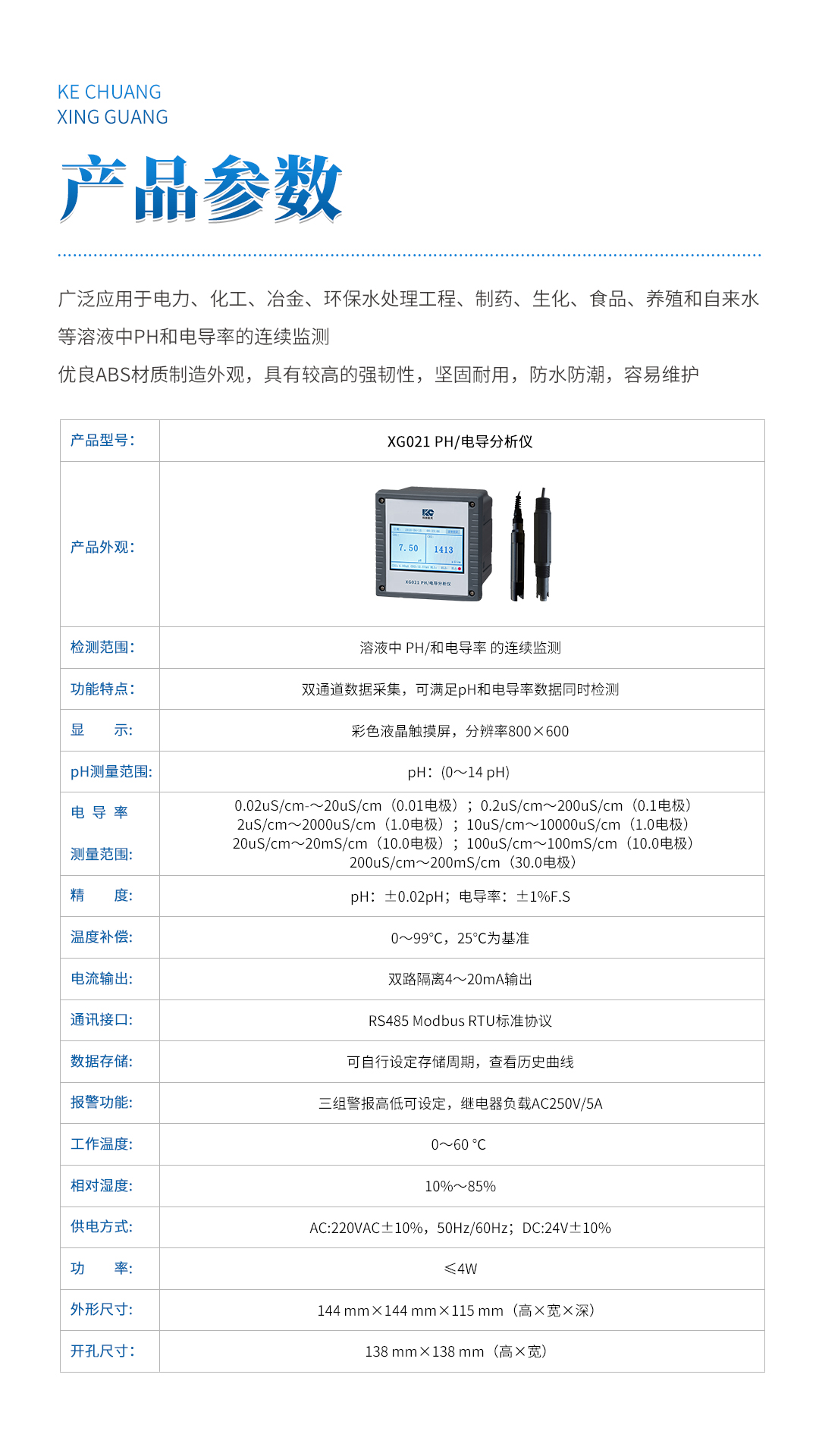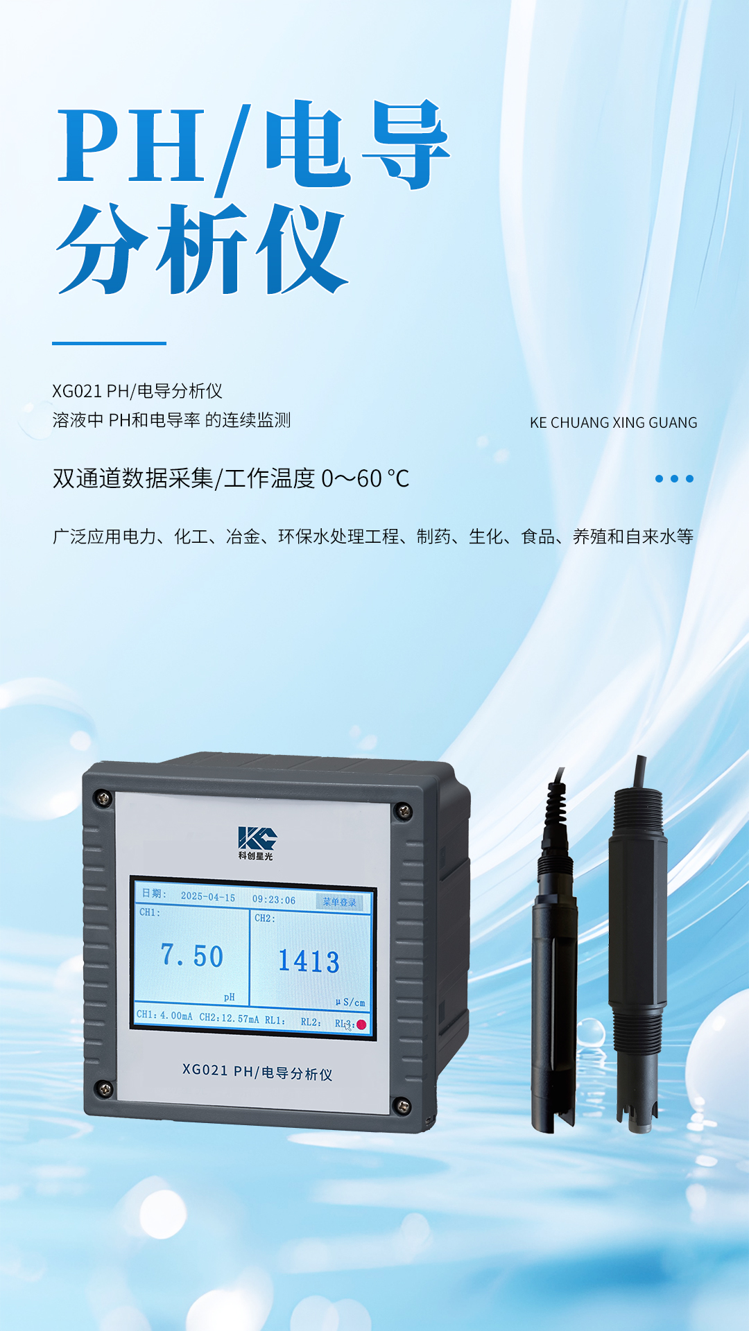 XG021 PH/電導分析儀 廣泛應用于電力、化工、冶金、環(huán)保水處理工程、制藥、生化、食品、養(yǎng)殖和自來水等溶液中PH和電導率的連續(xù)監(jiān)測。