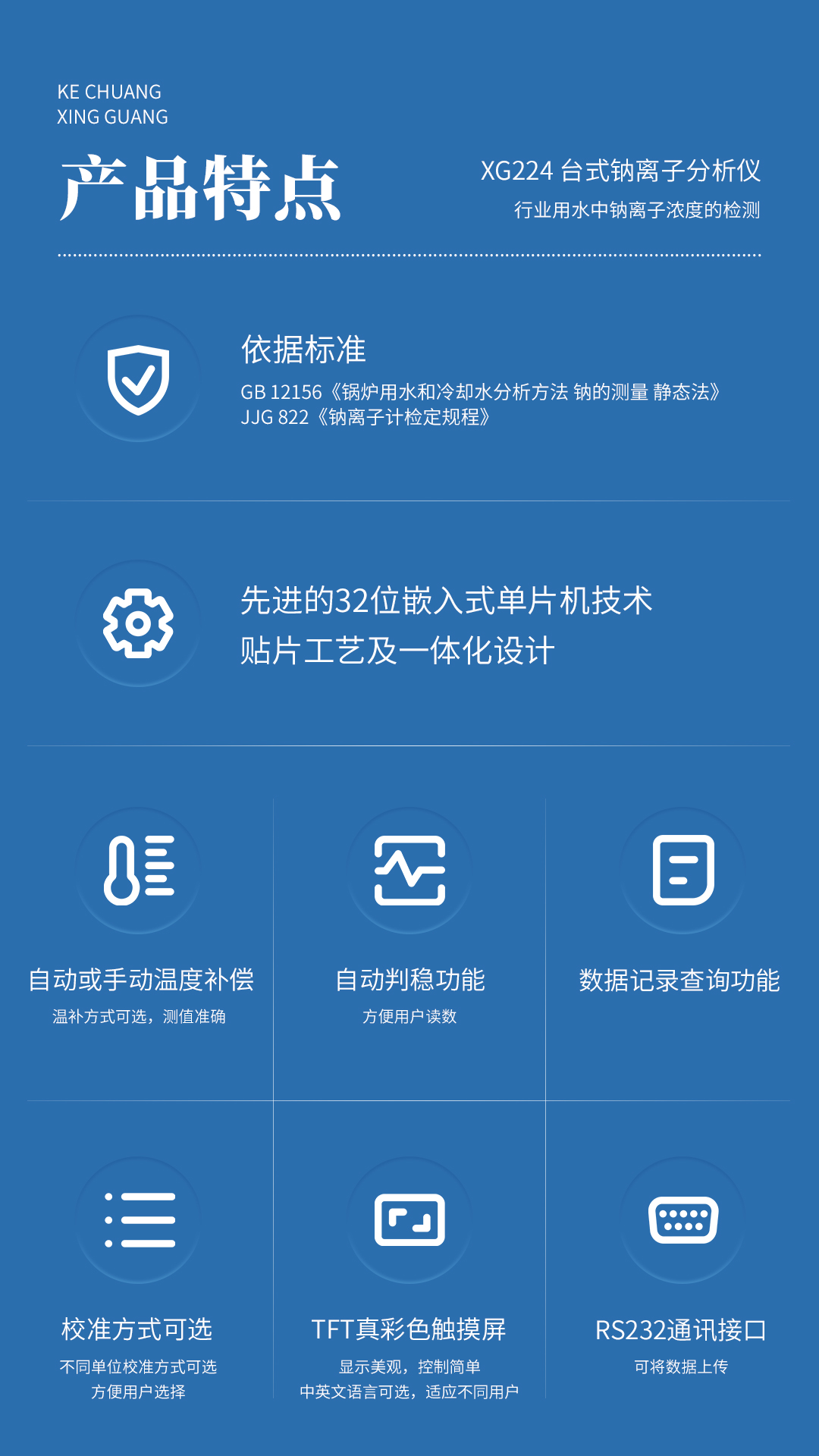 XG224 臺(tái)式鈉離子分析儀 依據(jù)GB 12156《鍋爐用水和冷卻水分析方法 鈉的測(cè)量 靜態(tài)法》和JJG 822《鈉離子計(jì)檢定規(guī)程》標(biāo)準(zhǔn)設(shè)計(jì)制造。應(yīng)用于電力、石化、造紙、制藥、食品、環(huán)保、科研院所、大專(zhuān)院校等行業(yè)用水中鈉離子濃度的檢測(cè)。