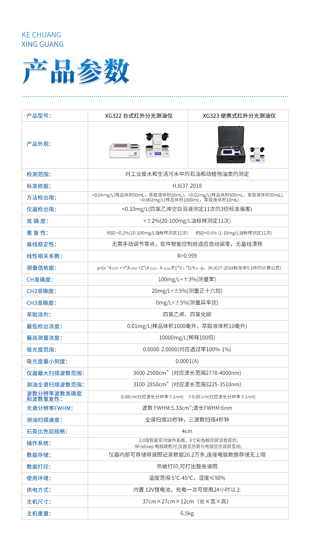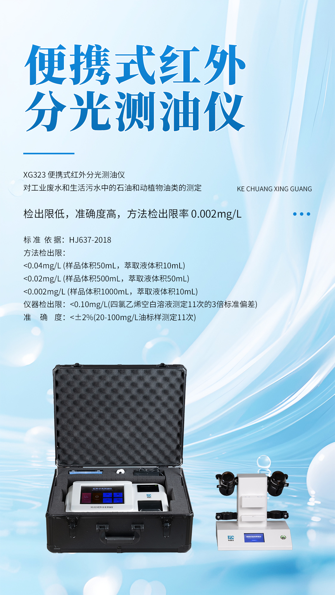 XG323 便攜式紅外分光測油儀 依據(jù)HJ637研發(fā)設(shè)計,廣泛應(yīng)用于工業(yè)廢水和生活污水中的石油和動植物油類的測定。應(yīng)用范圍包括石油化工、鋼鐵冶金、電子機械、光伏、高校教學、科研院所等領(lǐng)域的水質(zhì)檢測。