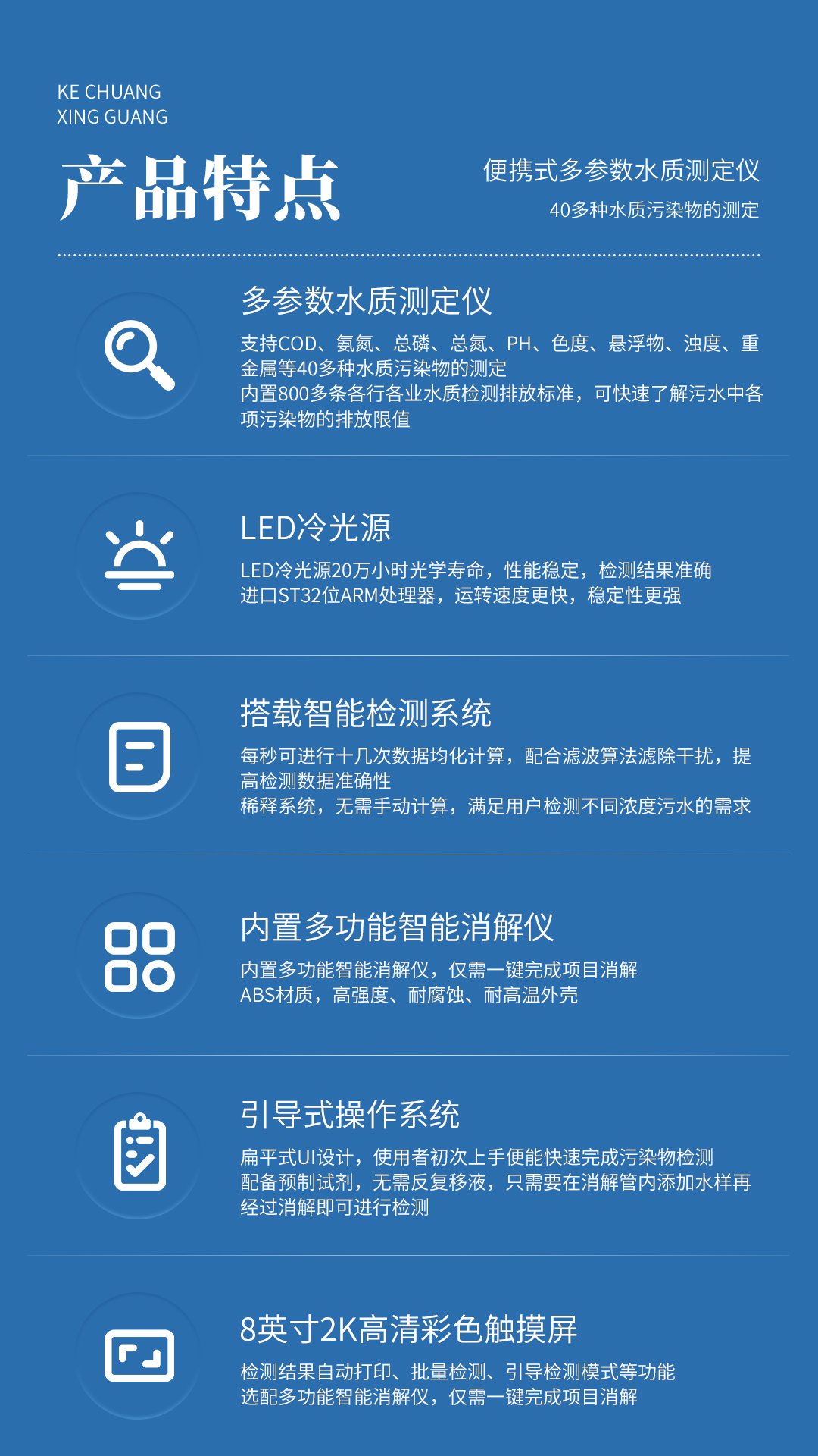 ● 支持COD、氨氮、總磷、總氮、PH、色度、懸浮物、濁度、重金屬等40多種水質(zhì)污染物的測定。