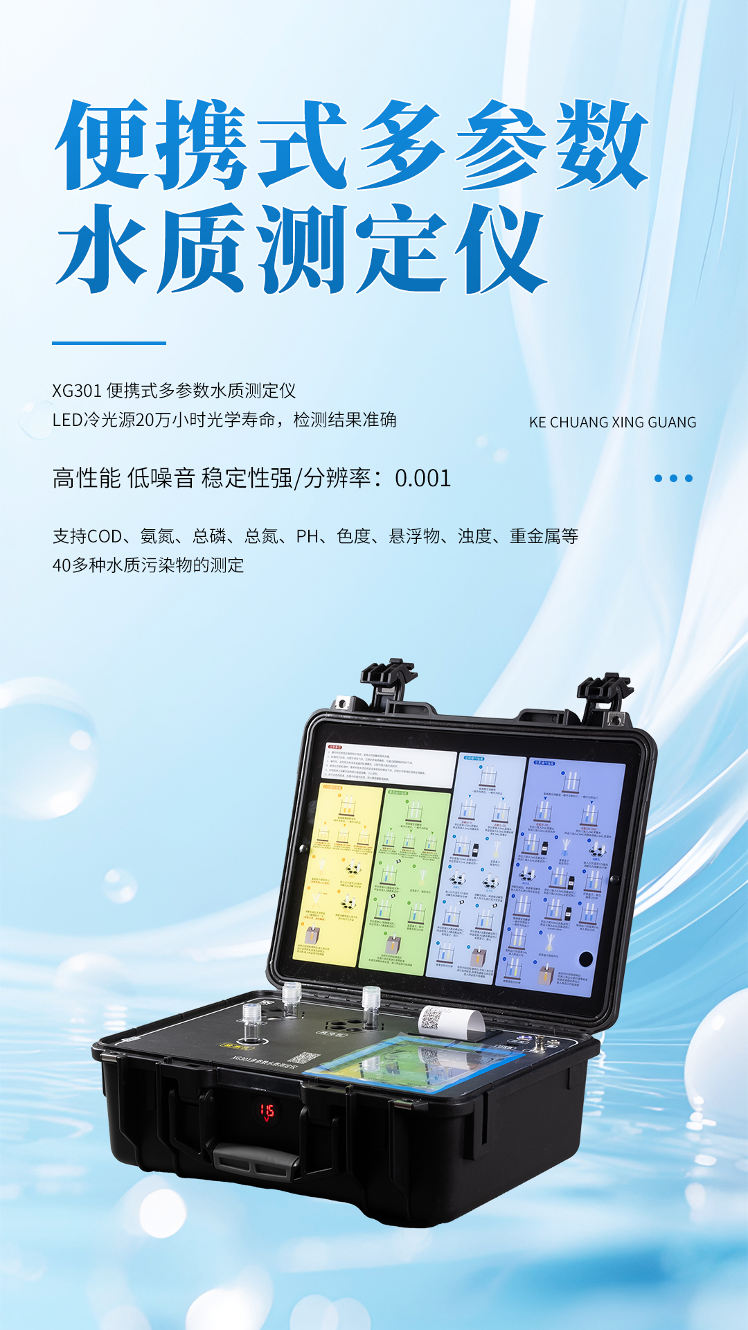 XG301 便攜式多參數(shù)水質(zhì)檢測儀 是一款專業(yè)級的戶外便攜式水質(zhì)檢測儀,一體式集成設計,一機實現(xiàn)消解、風冷、檢測等功能。內(nèi)置大容量鋰電池可實現(xiàn)無外接供電工作,儀器采用LED冷光源和光學結構,搭載智能檢測系統(tǒng),每秒可進行十幾次數(shù)據(jù)均化計算,進口ST32位ARM處理器,運轉速度更快,穩(wěn)定性更強。從而飛躍性的實現(xiàn)了水質(zhì)測定儀的智能化、高性能、低噪音、穩(wěn)定性強的特點。儀器內(nèi)置800多條各行業(yè)水質(zhì)檢測排放標準,可快速了解污水中各項污染物的排放限值。8英寸2K高清彩色觸摸屏,讓檢測結果直觀明了,可檢測COD、氨氮、總磷、總氮、懸浮物、色度、濁度、重金屬等40多種檢測項目,產(chǎn)品內(nèi)置水質(zhì)分析、光度測量、系數(shù)曲線、樣品曲線等多種應用程序。儀器廣泛應用于科研院所、污水處理、環(huán)境監(jiān)測、石油化工、造紙、制藥、印染、紡織、皮革、釀酒、電子、市政、高校等行業(yè)并受到廣大用戶一致好評。