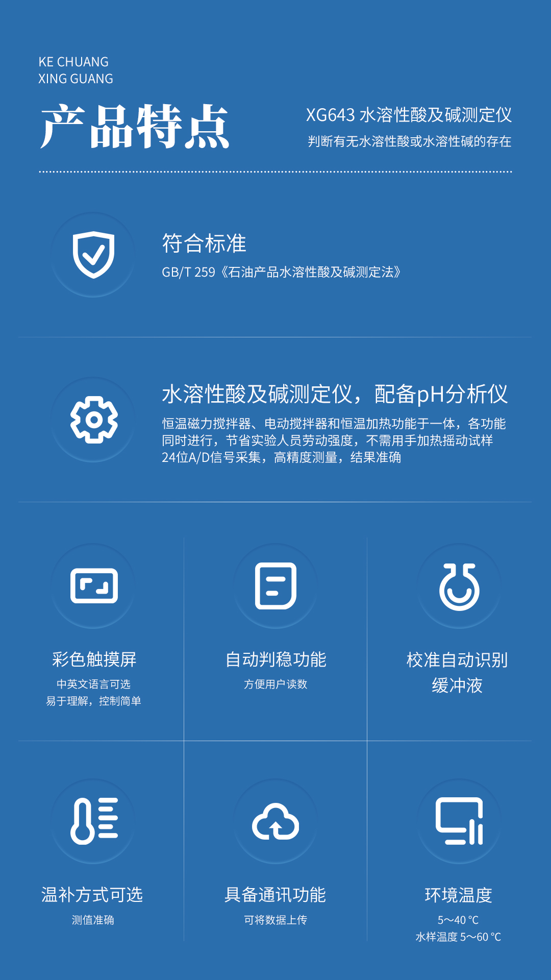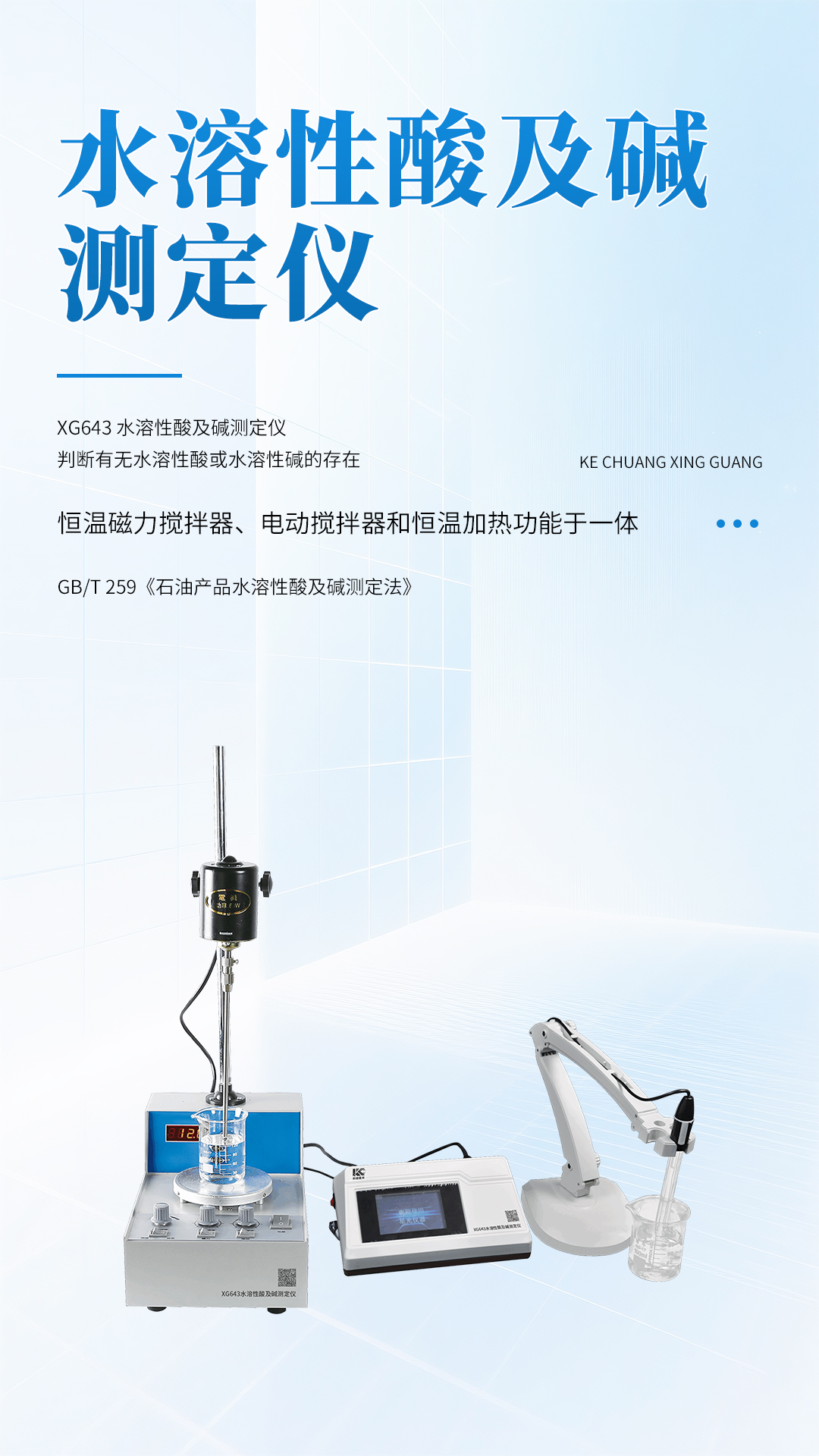 XG643 水溶性酸及堿測定儀 根據(jù)標準GB/T 259《石油產(chǎn)品水溶性酸及堿測定法》研發(fā)制造,可廣泛應(yīng)用于電力、石油、化工、鐵路、航空、商檢及科研等部門。